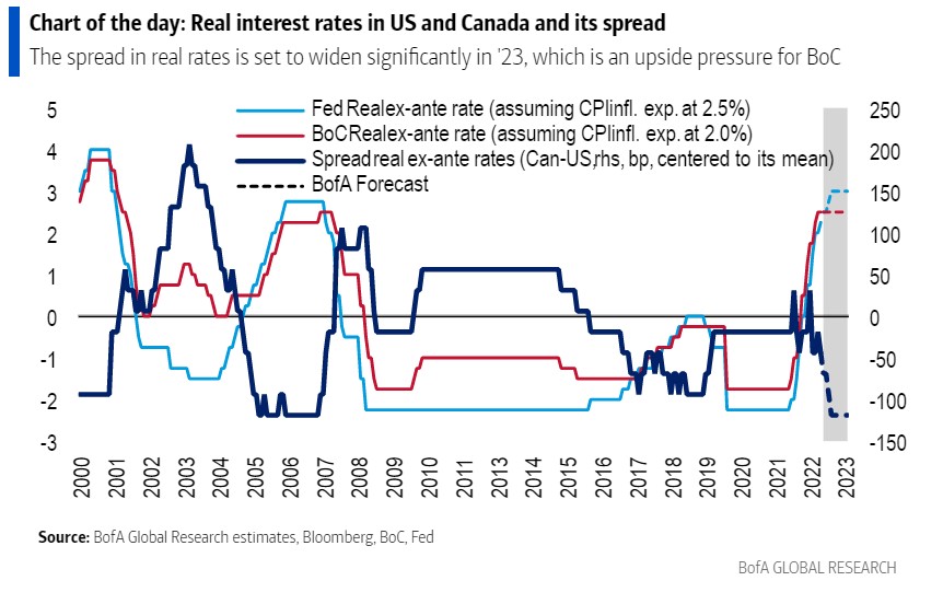 Economists at BofA concur, noting that the unemployment rate is still quite low, and inflation is still quite high, which puts upside pressure on the BoC. “But the main pressure may come from the US Fed. The Fed's job is not done yet and we expect another 75 basis points of hikes in the US. As the Fed hikes while the BoC remains on hold, the spread in real rates will widen notably, weakening Canada's policy stance.”