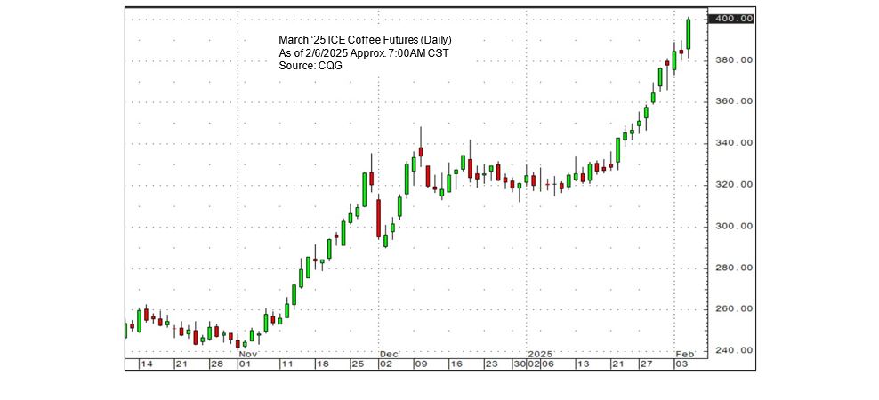 There are signs, however, that high prices are beginning to curb demand. After several months of record shipments in late 2024, Brazilian coffee exports fell by more than 8% year-on-year in December. Meanwhile, new EU import regulations, originally set to take effect on 1 January, have been postponed until the end of 2025, potentially easing demand pressures in the near term.